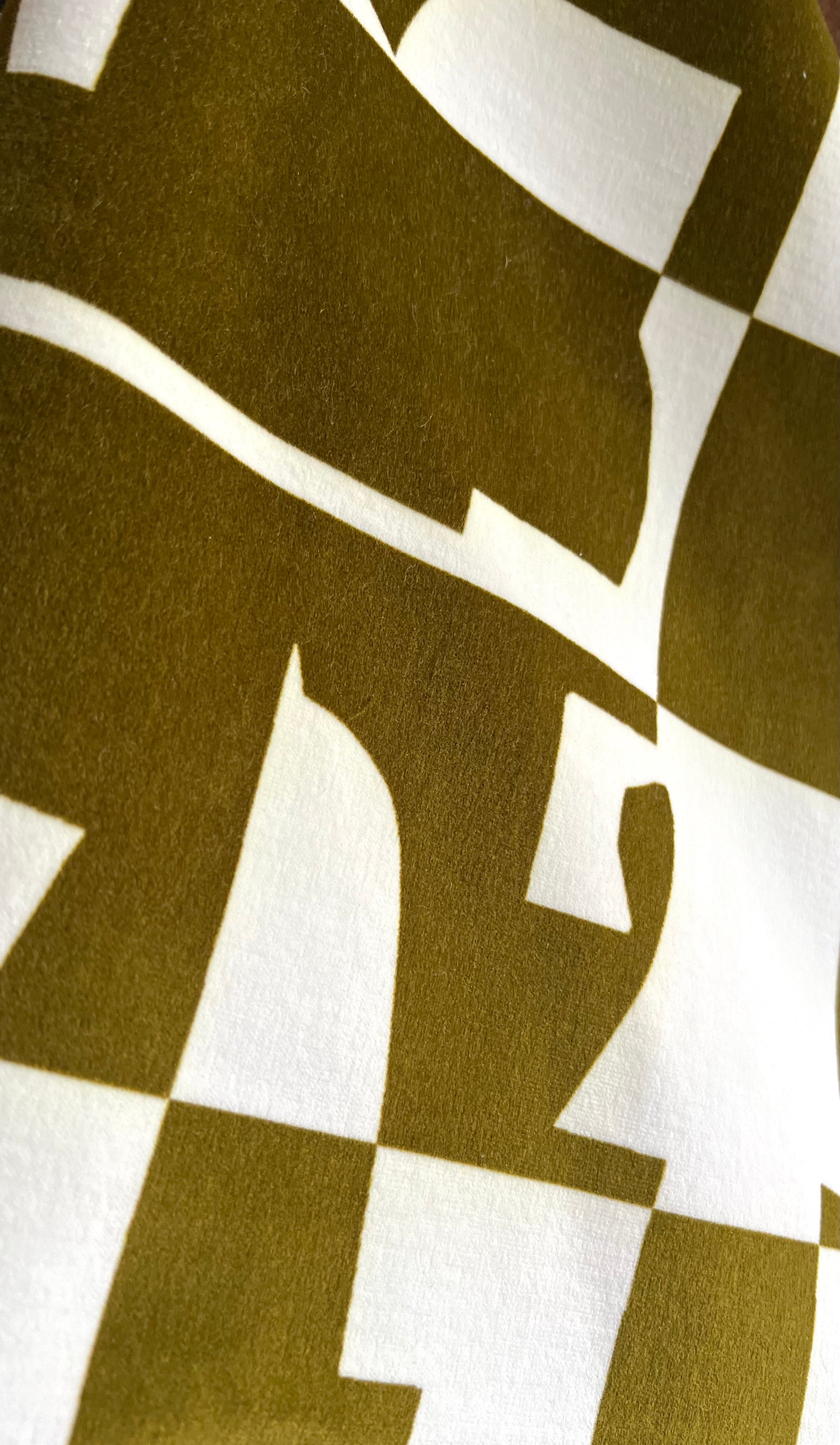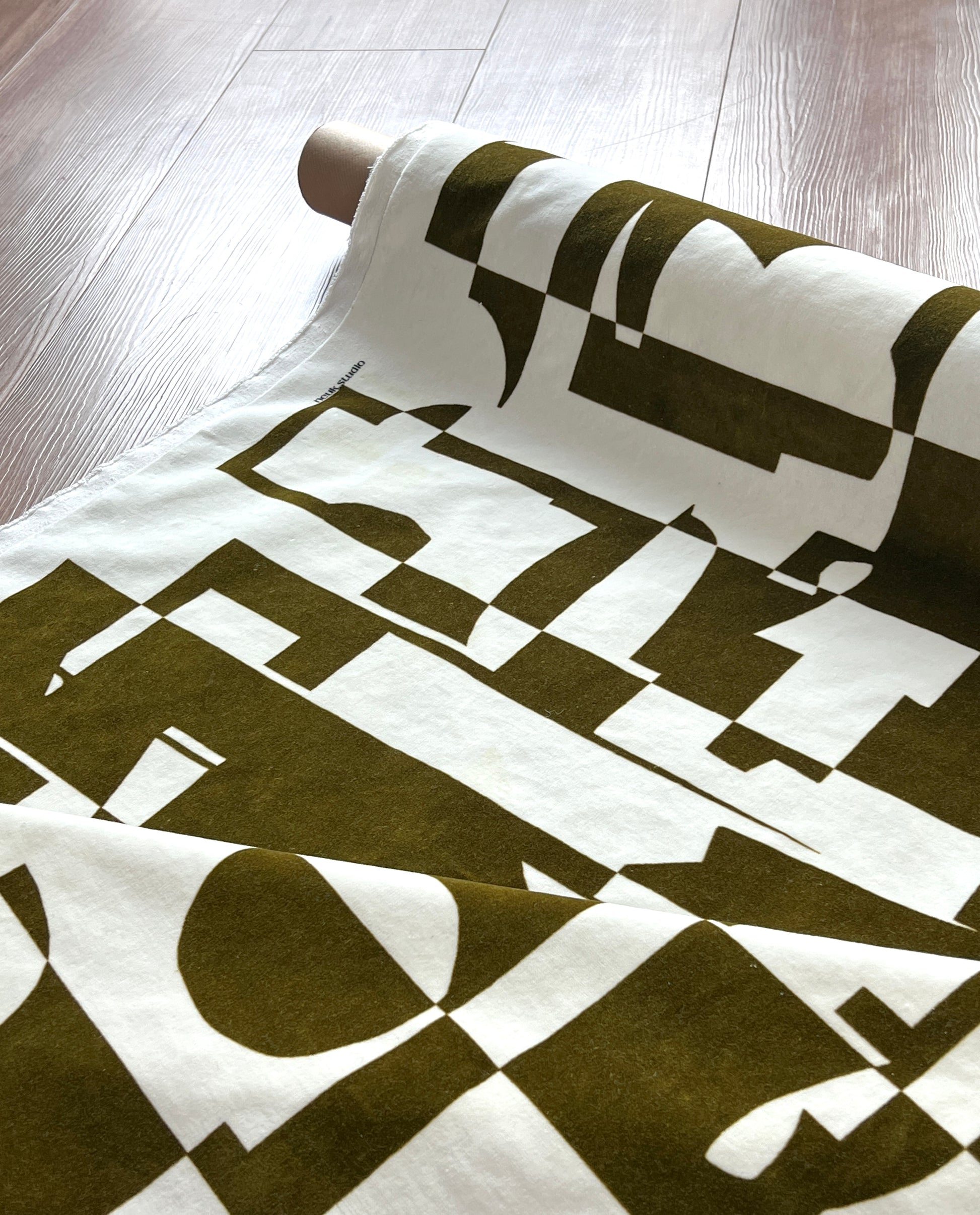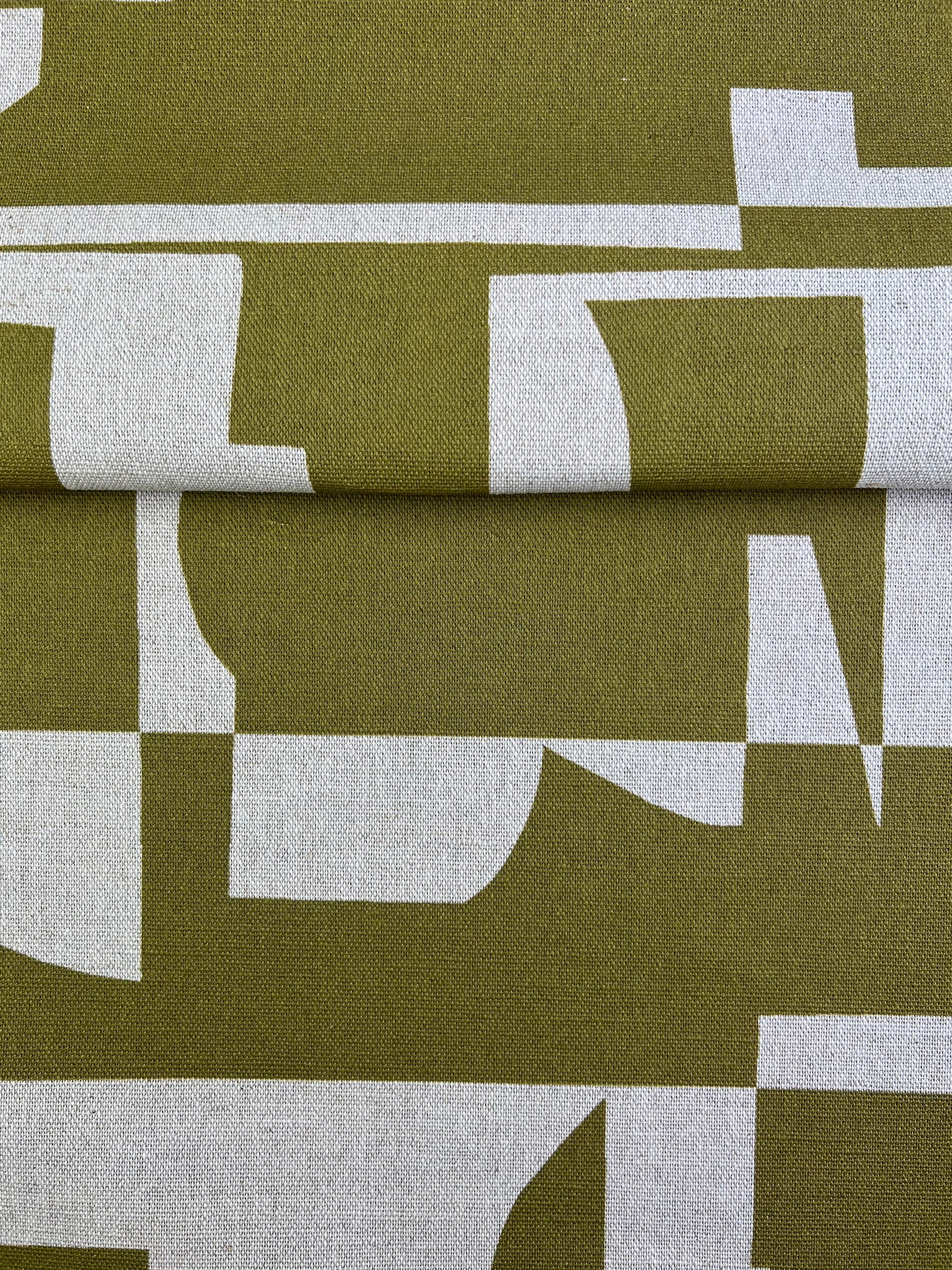 Arlo is an eye-catching, two-tone design featuring striking colour combinations and geometric shapes that create a modern, stylish look. Whether used for upholstery or as a statement piece, Arlo’s simple and contemporary composition will add energy and character to any space. This Green Ochre colourway is available on a beautiful oatmeal linen as well as a luxurious white cotton velvet.