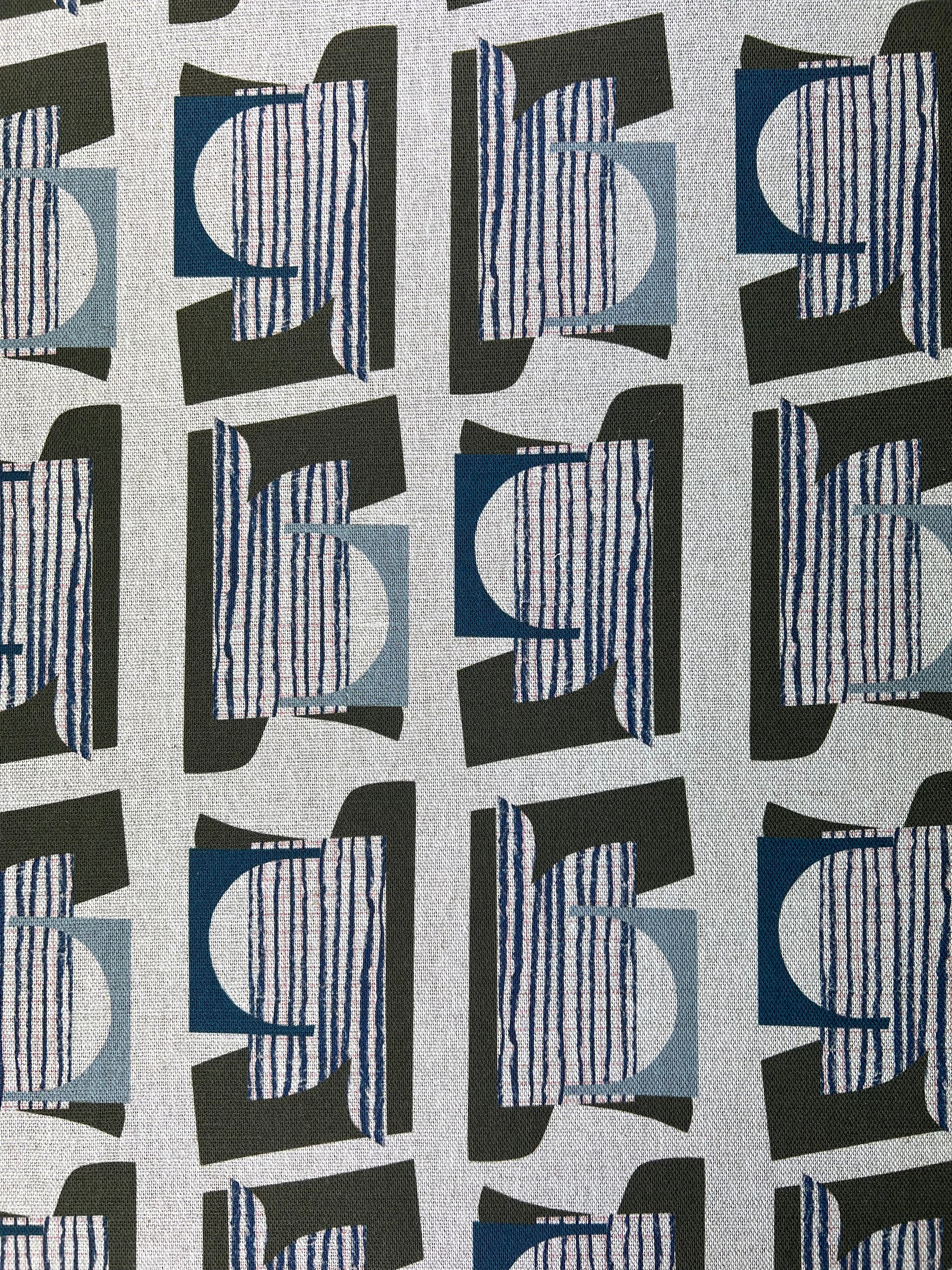 Mirren features a collage style repeat design with subtle hand-drawn details that add a soft, organic touch. This Dark Olive and Blue colourway is printed on a beautiful oatmeal linen.
